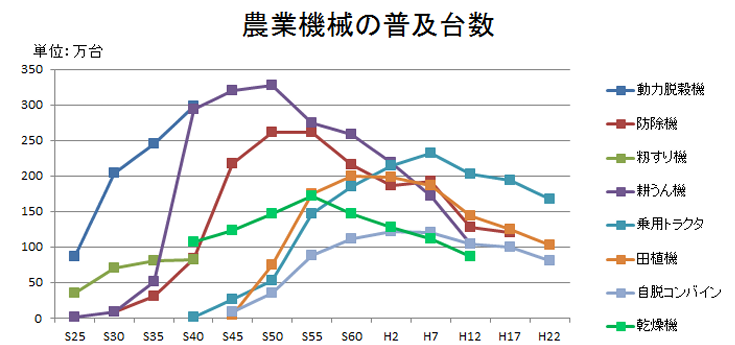 この状況を変えて行ったのが、化学肥料の普及です。化学肥料は食糧増産と農業生産力向上を目的に拡大し、稲作や畑作の肥料を生活圏の野山から調達する代わりに、購入して使用する形に移行しました[6]。