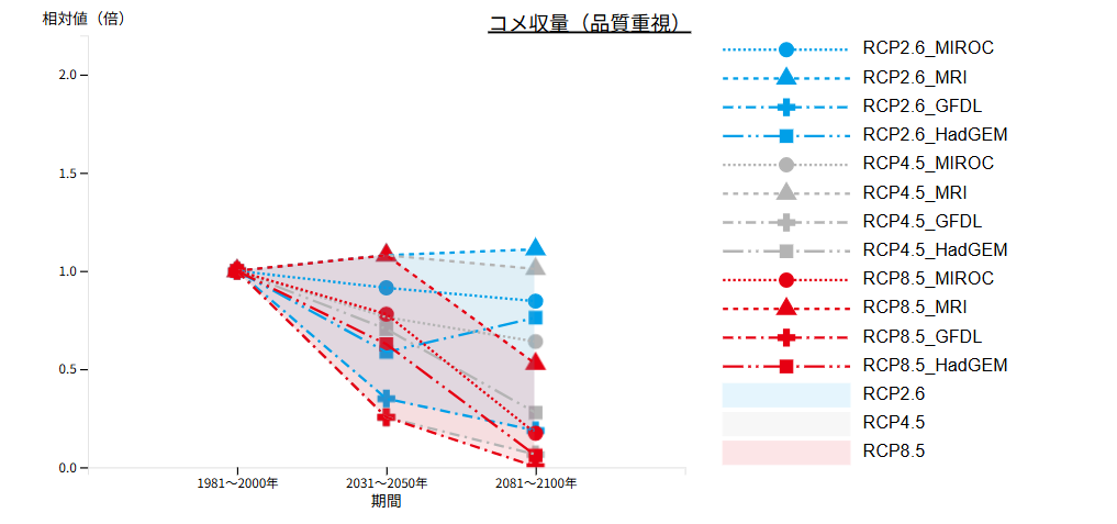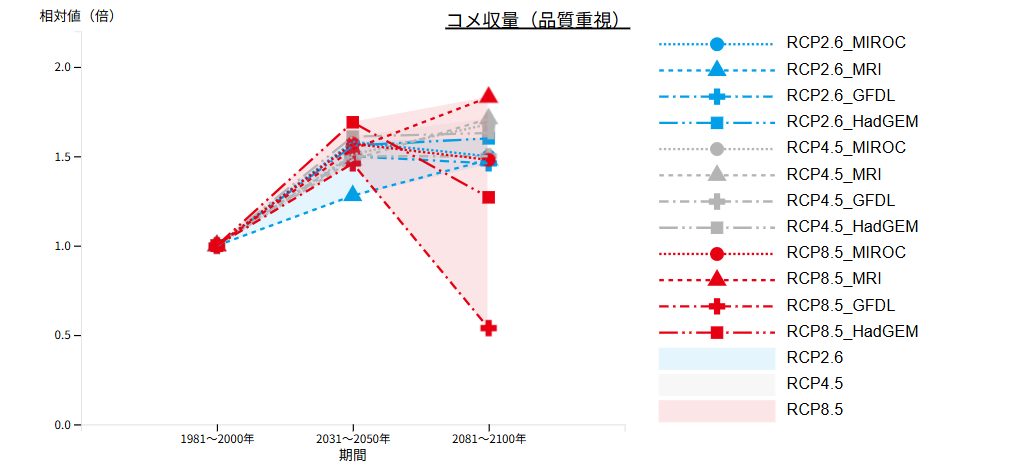 これを見ると北海道では高品質な米の収量が2050年に向けて増加する可能性が示されています。一方で、気候変動対策が進まずに気温が大幅に上昇した場合(年平均気温が産業革命以前と比べて4℃以上高い RCP8.5のケース)では2100年頃には再び品質低下するリスクも示されています。