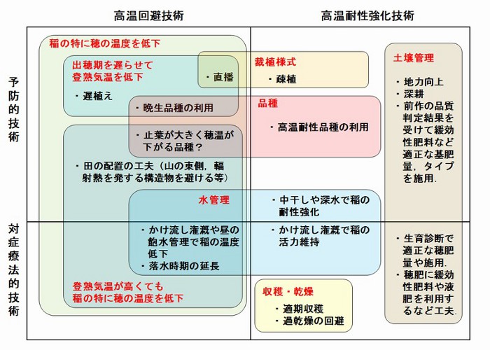 米栽培において高温障害を防ぐには、単に気温を下げる工夫をするだけではなく、稲の品種選びや水管理、肥料の最適化などの適応策を含めた、総合的な対策を講じることが重要とされます。