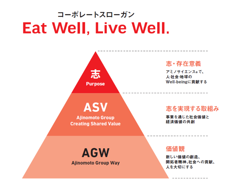 筧様:3つあります。1つ目は、味の素グループの理念体系の最上位にある「志(パーパス)」と価値観・行動指針である「AGW(Ajinomoto Group Way)」を実際の行動(実行力)に直結させること。