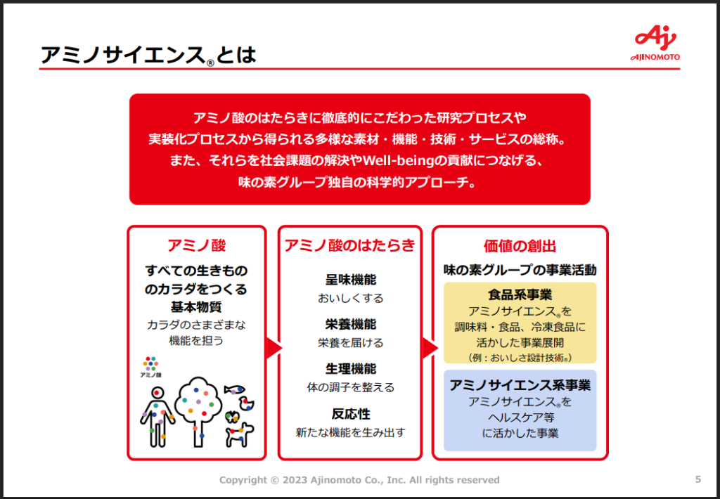 ※味の素グループは、100年以上にわたるアミノ酸のはたらきの研究や実装化のプロセスからさまざまな素材・機能・技術・サービスを創造してきました。さらにそれらを最大限に活用し、社会課題の解決や Well-being へつなげる独自の科学的アプローチを展開しています。味の素グループでは、その科学的アプローチを総称して「アミノサイエンス®」と呼んでいます。