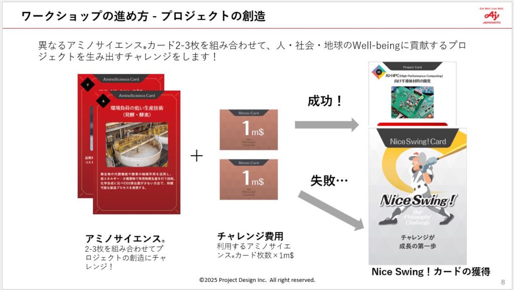 実際のアミノサイエンス®の組み合わせで社会課題をどう解決できるのか? ワークショップで使用するカードを現実に即した内容としてつくり込むことで、従業員が「自分たちの事業にはこんな可能性があったんだ」と本気で没入し、深い気づきを得られるようにしました。