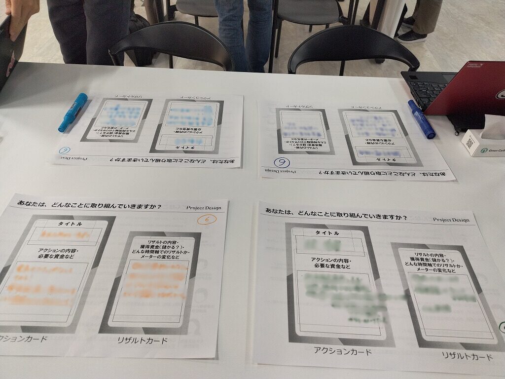 カードゲーム「2050カーボンニュートラル」の体験後に、ゲームで使用したアクションカードを参考にしながら、「自分が組織のアクション・市民のアクションを実行するとしたら?」という観点で行動を書き込み、宣言するワークを行いました。