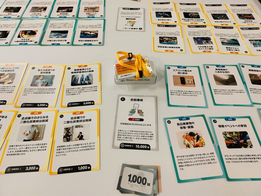 ゲームでは、参加者が1つの組織のメンバーとして1〜4人のチームを組み、 他のチームと様々な交渉を行いながら、組織の活動とプライベートの活動を行います。ある組織では獲得資金を増やすことを目指し経済活動を行っていきます。また、ある組織では排出削減量の目標に向かって環境活動を行っていきます。