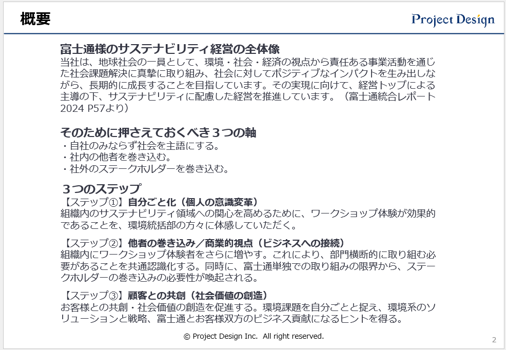 祝様:現在はワークショップを「手上げ式」で募集しているため、参加者がサステナビリティへの関心の高い層に偏ってしまっています。現状は日ごろからアンテナを高く張っている Sales や Marketing 職が大勢参加してくれているのですが、それは「富士通のサステナビリティの取り組みをお客様にきちんと話せるようになりたい」という想いがあるからですね。