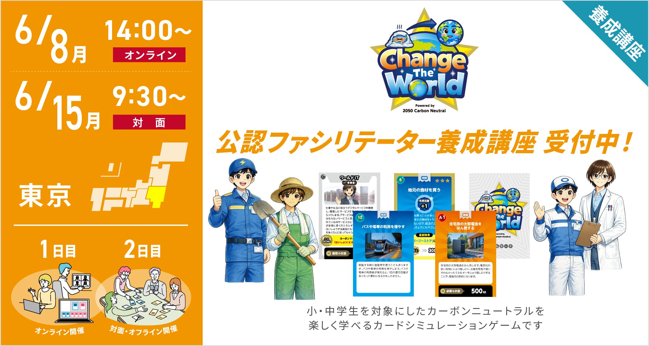 本養成講座は、カードゲーム「Change The World – powered by 2050 Carbon Neutral」を体験された方を対象に実施させていただきます。必ずカードゲーム「Change The World – powered by 2050 Carbon Neutral」を体験してからお申込みください。