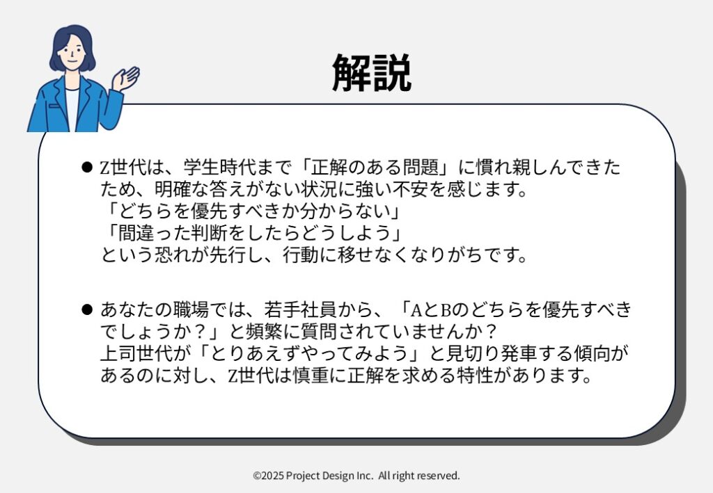 このように、デジタルネイティブなZ世代以降の若者は「正解にアクセスしやすい環境」で育ってきたことが、正解病(常に明確な正解を求め、曖昧さや不確実性を極度に嫌う傾向)の進行を進める温床になっています。