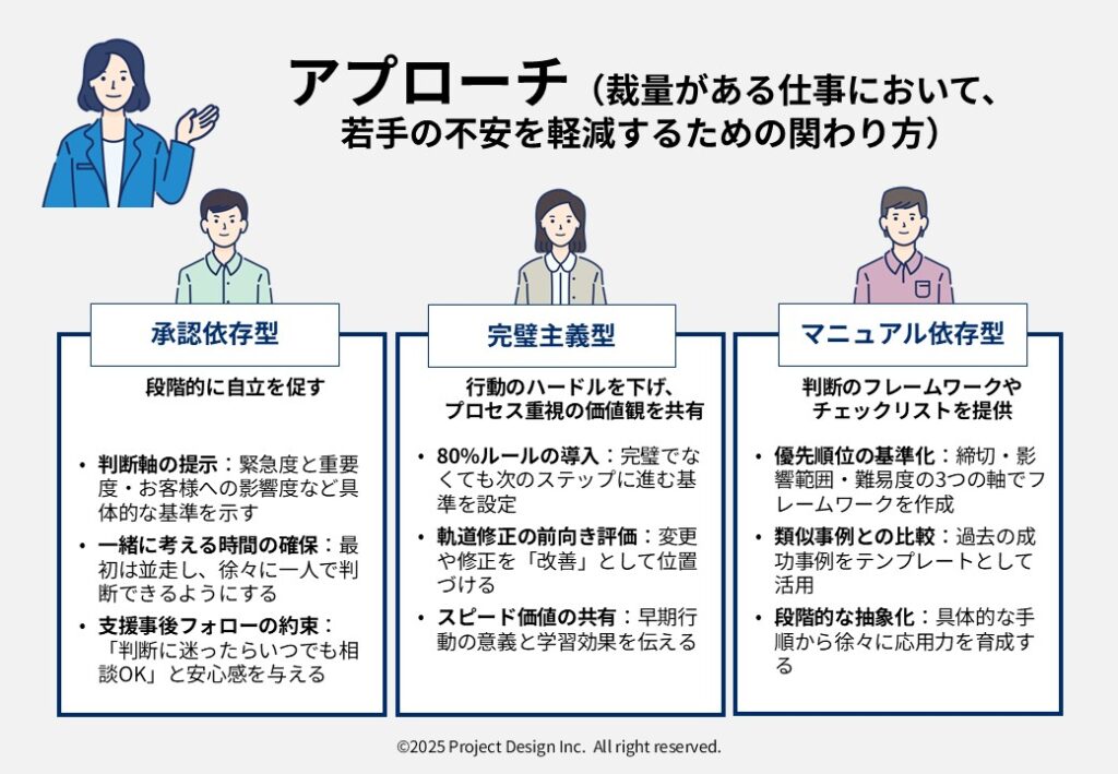 • 他者からの保証・上司や先輩の承認なしに判断・行動できない