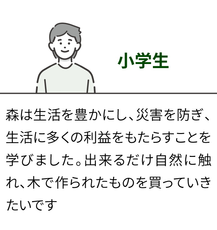 「木を使う=環境破壊」という誤解を解き、森を守るには適切な利用と手入れが必要であることを理解します。