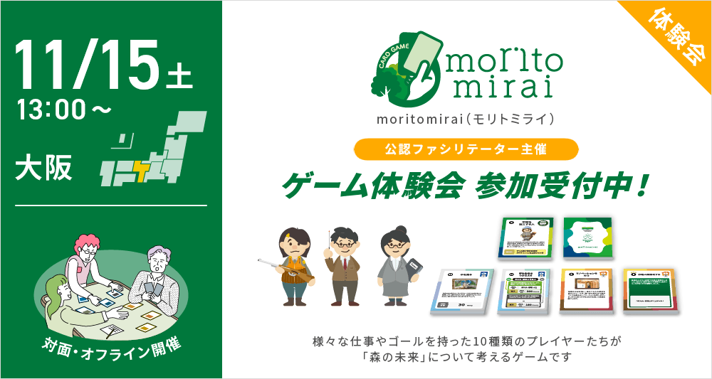 森の現状に関しての正確な知識や理解がないために起きているさまざまな問題(森林資源に関する誤解、森林の誤った活用、森に関して無関心な市民の増加)を解決する助けとなるツールとして、カードゲーム「moritomirai(モリトミライ)」をご活用いただければと思います。