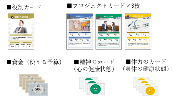 各メンバーに役割カード1枚と資金、精神・体力のカードのほか、プロジェクトカードが3枚配られます。