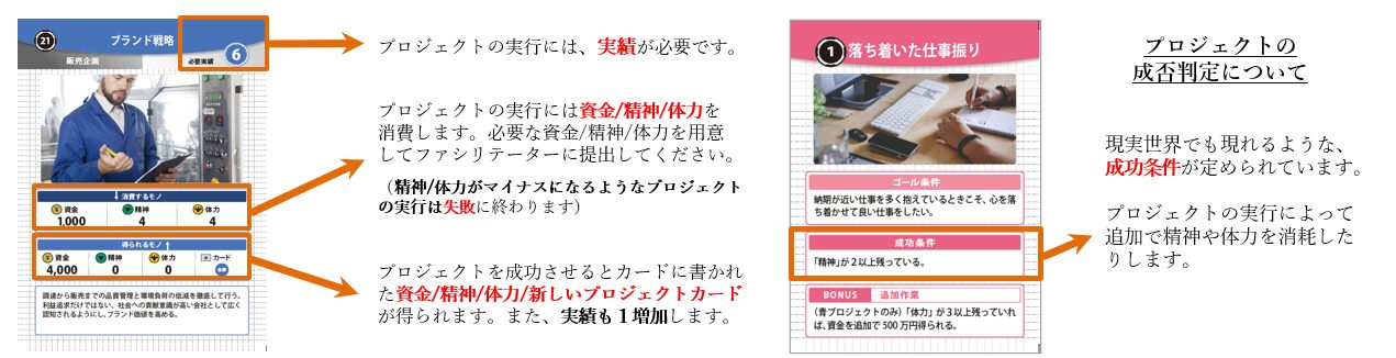 配られたプロジェクトカードを実行しながらゲームを進めていきます。プロジェクトは実行すれば成功するというわけではなく、残業の有無や体調管理などといった成功条件が定められています。各役割でゴールや状況が異なる状況のなかで、適切な人がプロジェクトを実行する必要があります。