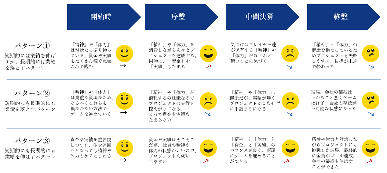 健康経営ゲームでは、会議と行動タイムを3回(3ターン)繰り返して進行します。ゲームは大きく3パターンに分かれて展開します。