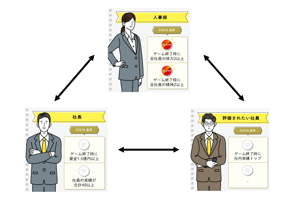 現実世界と同様、プレイヤー毎に心身の健康状態とゴールが異なります。そのため、仕事を押し付け合うのではなく、多様性を理解し合いながら最適な役割分担をすることが求められます。