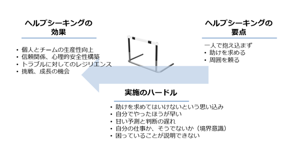 難易度の高いプロジェクトに一人で取り組むのは困難なため、いかに周りの助けを求めて巻き込んでいくか(=ヘルプシーキング)を意識することが大切です。