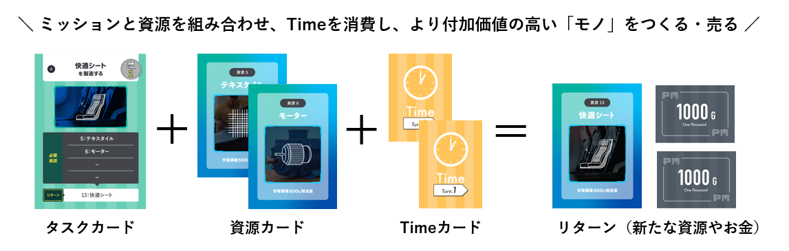 タスクカードに書かれた「必要資源」を集め、ファシリテーターに提出することで「新たな資源」やお金などのリターンが得られます(タスクの実行にはTimeカードを消費します。1ターン4枚の限りあるTimeでどのタスクを実行するのかを選択します)。