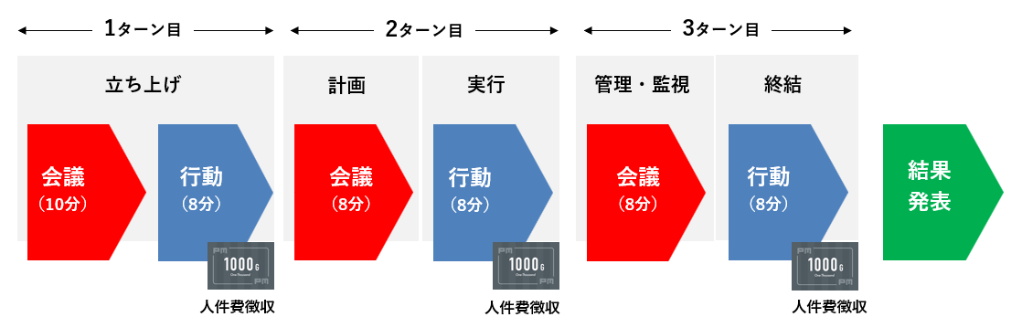 ゲーム時間は60分程度。チーム内で話し合いを行う会議時間と自由に行動時間を1ターンとして、各ターンの終わりには人件費1,000G が徴収されます。これを合計3ターン行います。一連のゲーム体験を通じて、プロジェクトマネジメントの5つのプロセス(立ち上げ、計画、実行、管理・監視、終結)をシミュレーションすることができます。