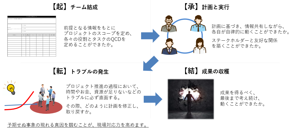 The プロジェクトマネジメントでは、ゲーム体験を通じて、見落としていた自らの視点や足りなかった情報に気づき、リスクの発生を先読みするための視座を高めていきます。