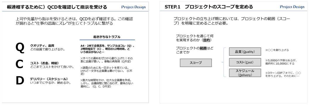 ビジネスに欠かせない専門的な技術や人間関係のスキルを効率よく活かすための「段取り力」を身につけるきっかけをThe プロジェクトマネジメントは提供します。具体的には、あらゆる仕事に伴うQCD(Quality:納品の質、Cost:コスト、Delivery:期限)を理解することと、その中においても、限られた時間で物事を推し進める力を育成していくことが可能です。