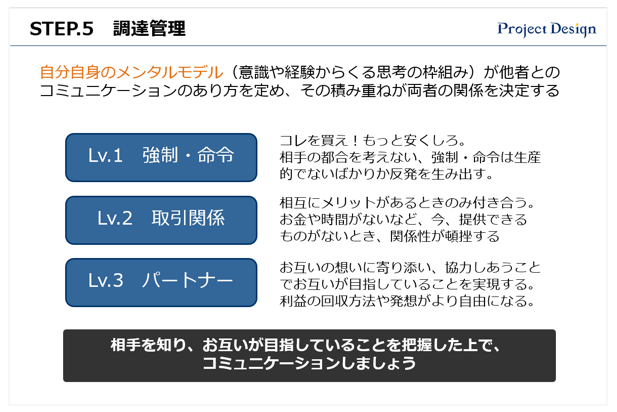 自社には無い技術や部品は、他社との交渉で獲得しながら、場合によっては、計画の見直しが必要になります。変化するビジネス環境の中で、的確にプロジェクトを管理・進行するプロセス構築力を学ぶことができます。