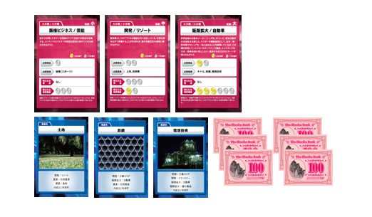 各メンバーに赤色のビジネスカード3枚と青色の資源カード3枚、600億円が配られます。ヒトは参加者自身、モノは赤と青のカード、カネはピンクのカードで表しています。