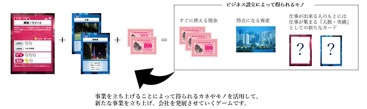 「The 商社」は、参加者が1つの会社のメンバーとしてチームを組み、 他のチームと交渉を行いながら、事業を立ち上げて自分たちの会社を大きくしていくビジネスゲームです。