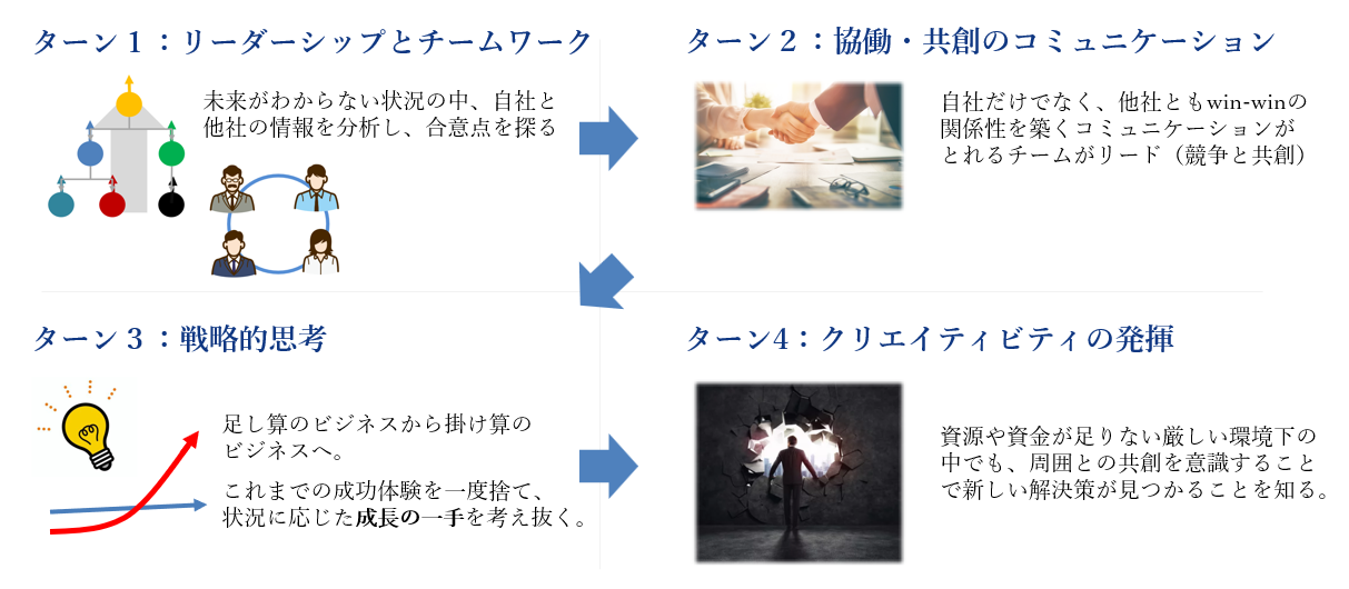 The 商社では、計画タイムと行動タイムを4回(4ターン)繰り返しながら、会社を発展させていきます。それぞれのターンでは、特に次のような能力の発揮が求められます。